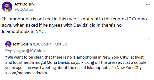 Andrew Cuomo has repeatedly made Islamophobic remarks against frontrunner Zohran Mamdani throughout this year's NYC mayoral campaign. He routinely mispronounced his opponent's name during debates. His campaign has released several discriminatory videos that altered Mamdani's appearance and used AI to depict "criminals for Zohran Mamdani." He invoked 9/11 and suggested that Mamdani would cheer a terrorist attack as NYC's mayor. And when this persistent, racist rhetoric is called out directly, Cuomo claims that "Islamophobia is not real in this race."